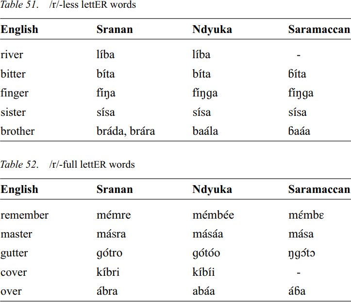 This set also involves an /r/-final variant and an /r/-less one in Sranan. There does not seem to be any conditioning involved. The /r/-less variant replaces /-´r/ with /-a/. The /r/-full variant has a final vowel that echoes the previous vowel. Words illustrating this set include: river, bitter and gutter.