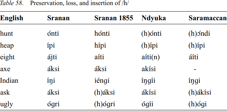 In modern Sranan [h] at the beginning of words is a mark of emphasis. However up till the 19th century /h/ was a phoneme of Sranan. It also occurs optionally in Ndyuka and Saramaccan at the present. There is a set of words in the Suriname creoles that may begin (or in the case of Sranan, began) with /h/, and another set that always begins with a vowel. These do not however agree with the corresponding sets in English