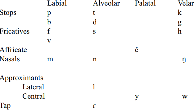 [ǰ] and [ʃ] are not included in the inventory above, but are here considered phonetic variants of /č/ and /s/ respectively. Similarly, we will subsume [z] and [ʃ] under the voiceless /s/ as free variants, though clearly, some speakers apply a voicing distinction here. Slight feature differences in voicing, manner and place of articulation may therefore alter the individual speakers’ distribution of sounds in their phonemic and phonetic systems.