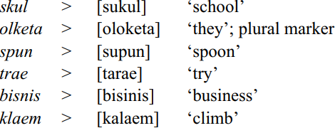 In addition, as consonant clusters do not occur in most of the languages of the Solomon Islands, speakers will tend to insert epenthetic vowels in Pijin words in order to avoid such clusters. The choice of the vowel is directed by rules of vowel harmony.