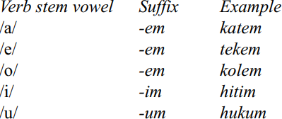 Thus, while kat-, tek- and kol- become katem, tekem and kolem, /huk/ ‘to hook’ becomes /hukum/ ‘to hook something’ and /hit/ ‘to hit’ becomes /hitim/ ‘to hit someone’.