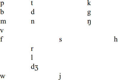 Note that this is identical to the inventory provided by Crowley for Bislama (this volume) apart from the inclusion of the affricate /ʤ/. The consonants are generally close to their IPA values.