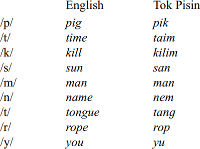 The great majority of Tok Pisin lexical items are ultimately derived from English, and a number of correspondences between English sources and Tok Pisin words can be demonstrated. A number of these correspondences are listed in Laycock (1985: 296). The phonemes /p, t, k, s, m, n, ŋ, r/ and /y/ are generally unchanged, as in the following, all shown in initial position: