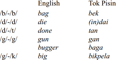 Other phonemes in the core Tok Pisin inventory also present in English may be variably represented. Voiced stops, for example, may appear as either voiced or unvoiced in Tok Pisin in initial and medial position, but always devoiced in final position: