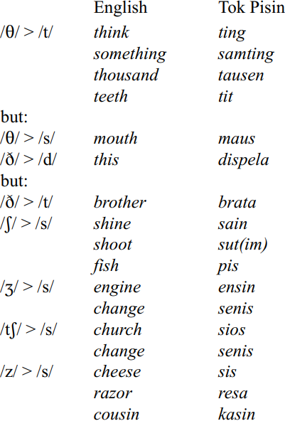 Other English consonants not normally found in Tok Pisin may correspond as follows: