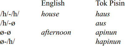 Laycock does not produce any examples for English /b/ equivalent to Tok Pisin /p/, and there are only one or two very low frequency variants in my corpus (Smith 2002) such as panara for banara ‘bow’.