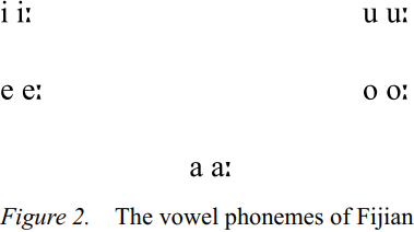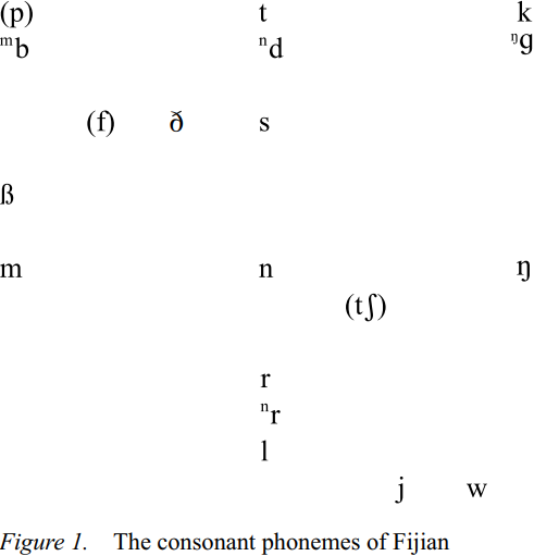 In order to understand the phonology of the Fijian and part-European variety of Pure Fiji English phonology a brief overview of the phonology of Fijian needs to be considered. The phonology of Fijian has been described in detail by Geraghty (1983) and Schütz (1985). The consonant and vowel phonemes of Fijian are presented in Figures 1 and 2 respectively. Note that: