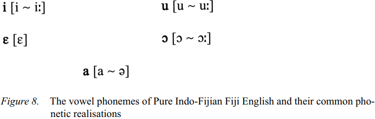 The vowel phonemes of Pure Indo-Fijian Fiji English and their most common phonetic realizations are shown in Figure 8.