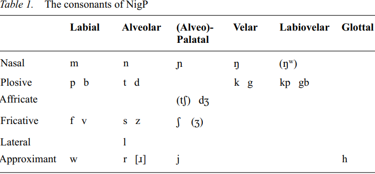Mafeni (1971) presented 24 consonant phonemes for NigP while Elugbe and Omamor (1991: 79) presented 24 systematic phonetic consonants. However, I now recognize about 25 at the systematic phonetic level. It is quite possible that some varieties may have more consonants – especially where local words are drafted in from time to time. However, it is not necessary to account for such transient consonants in a phonology of NigP.