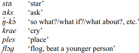 There are normally no more than two consonants allowed at the beginning of the syllable in NigP. A few words contain three in sophisticated, English-influenced, varieties. Thus the word street may be pronounced /strit/ or /srit/. The clusterless form /sitiriti/ is possible in totally uneducated varieties. At the end of a syllable, the maximum number of consonants allowed is two. Again we find, for the English word help for example, the two pronunciations /hεlp/ or /hεlεp/.