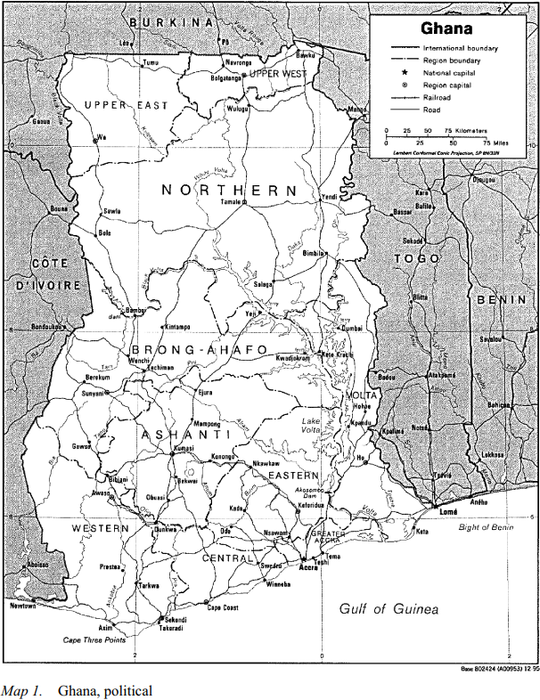 Ghana is a coastal West African country with a population of about 19 million (2000 census). The majority is concentrated in the southern, more fertile and developed part of the country, with Ashanti Region, Greater Accra, and Eastern Region the most populous administrative units. Population density is quite high in the southern urbanized centres, especially around the capital Accra, which is the major focus of Ghana’s internal migration.