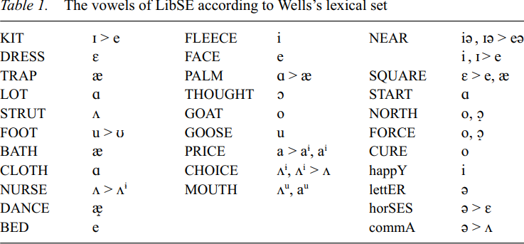 Further acoustic work is needed to determine the basis of the following contrasts: /i/ vs. /ɪ/ , /e/ vs. /ε/, and /o/ vs. /ɔ/. The question is the extent to which the contrasts are based on differences in length, height, and/or peripherality. It is also possible that a tense/lax distinction forms the basis for the contrasts; if that is so, it would be necessary to address the relationship of the tense/lax distinction to the other distinctions, an ongoing issue in the study of English vowels. The American English generalization that lax vowels other than /ə/ can only occur in closed syllables does not hold on the surface in LibSE: [tε] is a common pronunciation of tell, and [sɪ] of sit. In the case of /e/ vs. /ε/ and /o/ vs. /ɔ/, there seems to be a clear height difference, with the first of the two vowels the higher of the two.