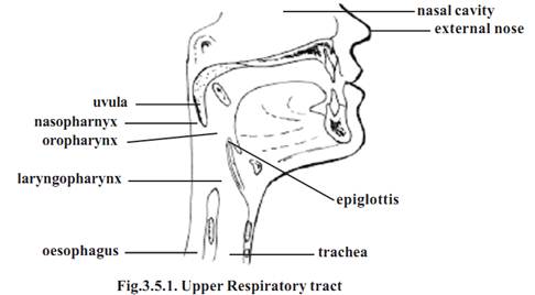1-Nasal cavity: The nasal cavity follows the external nose. The nose is a visible prominent structure. Internally it is supported by cartilage plates. The bridge of the nose is formed of the nasal bones and extension of the skull bones (frontal and maxillary). The respiratory passage is divided into two chambers by a median partition. The nasal passage opens to the outside through external nostrils. It opens inside by internal nostrils at the pharynx.