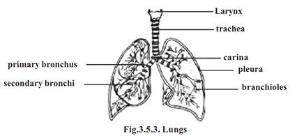 5-Lungs: the pair of lungs is the actual organs of respiration. Each lung is conical in shape. The base of the lung rests on the diaphragm. The right lung is larger than the left and it weighs around 620g. The left lung weighs 560g. The right lung has three lobes and the left lung has two.