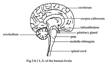 1-Prosencephalon (Fore brain) - It consists of the cerebrum and the diencephalon. The cerebrum is the largest part of the brain. It is divided into right and left hemispheres by a longitudinal fissure. However, at the base the two hemispheres are connected by a sheet of nerve fibres called the corpus callossum.