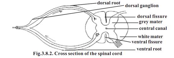 The dorsal and ventral sides have long fissures. There are 31 pairs of spinal nerves arising from the spinal cord. Each nerve has a dorsal root and a ventral root from the spinal cord. The dorsal roots have dorsal root ganglia.