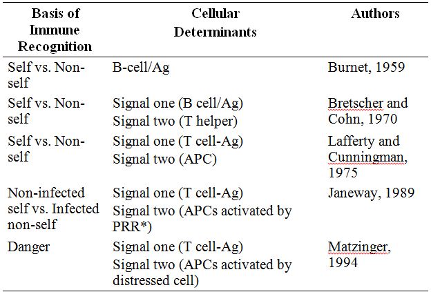 However, even before the precise identity of co-stimulatory molecules was known, a theoretical framework for T-cell function was proposed by Burnet (1959) and later refined over the ensuing years. These models for T-cell function incorporated the “two signal” concept of lymphocyte activation, originally proposed by Bretscher and Cohn, into a model of immune recognition based on “self vs non-self.” (Table I).