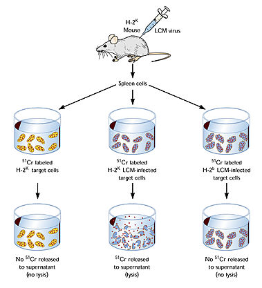 Fig. 3. Zinkernagel-Doherty experiment demonstrating that MHC restriction is required for activation of a cytotoxic T-cell response.