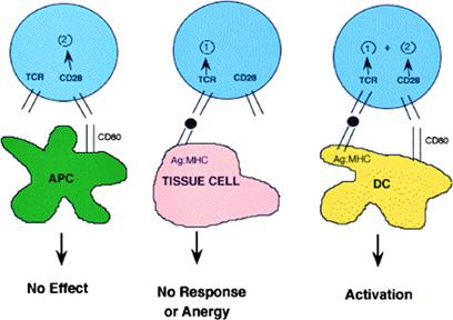 Fig. 4. The Two-signal theory of T-cell activation. When a T-cell encounters an antigen presenting cell (APC) that expresses costimulatory molecules but no foreign antigens, there is no apparent signal (left panel); when a T cell encounters a tissue cell or an APC that expresses antigens recognized by the TCR in the absence of costimulatory signals, the result is either no response or inactivation of the cell (anergy). However, when a T cell encounters an activated dendritic cell or other APC expressing both antigen and costimulatory molecules, then the T cell is activated to proliferate and undergo differentiation to an effector cell. Thus, T cells only become activated by their ligands when they are presented by a cell that expresses costimulatory molecules. From Abbas and Janeway Cell 100:129, 2000.