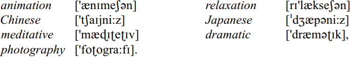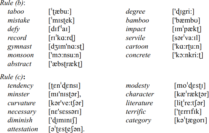The above rules can account for the placement of primary accent in a word of IndE. The first of these rules leads to the tendency of providing relatively strong stress to weak syllables such as in auxiliary verb forms, articles etc. Rules (b) and (c) go on to provide primary stress to a syllable in a polysyllabic word. Thus, for the application of rules (b) and (c) the following examples can be viewed: