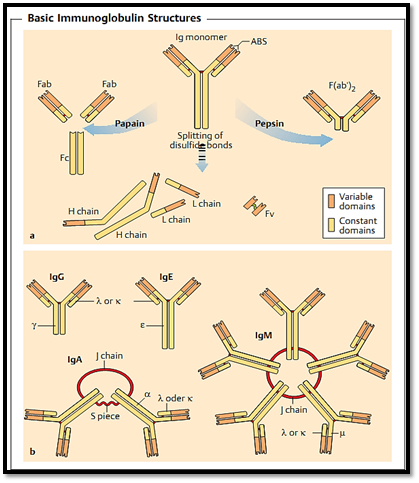 b Classes of immunoglobulins. IgM, IgD, IgG, IgA, and IgE are differentiated by their respective heavy chains (µ, δ, γ, α, ε). IgA (a chain) forms dimers held together by the J (joining) chain; the secretory (S) piece facilitates transport of secretory IgA across epithelial cells, and impairs its enzymatic lysis within secretions. IgM (i chain) forms pentamers with 10 identical ABS; the IgM monomers are held together by J chains. The light chains (k and k) are found in all classes of immunoglobulins.