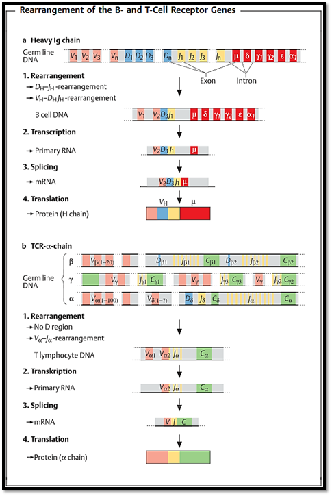 Fig. 2 explains the process of genetic recombination using examples of an immunoglobulin H chain and T-cell receptor a chain.