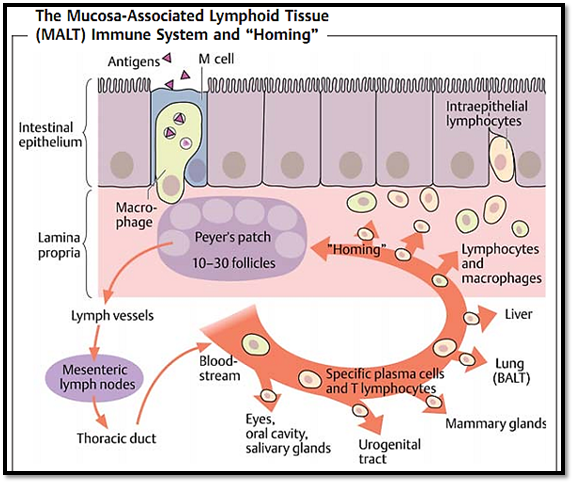 Fig. 3 Specialized APCs (M cells in the intestinal wall or pulmonary macrophages in the lung) take up antigens in mucosa and present them in the Peyer’s patches or local lymph nodes. This probably enhances T cell-dependent activation of IgA-producing B cells, which are preferentially recruited to the mucosal regions (“homing”) via local adhesion molecules and antigen depots, resulting in a type of geographic specificity within the immune response.