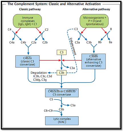 Fig. 1 The classic activation pathway is initiated by antigen-antibody complexes, the alternative pathway by components of microbial pathogens. The production of a C3 convertase, which splits C3 into C3a and C3b, is common to both pathways. C3b combines with C3 convertase to generate C5 convertase. C5b, produced by C5 convertase, binds to the complement factors 6-9 to form a membrane attack complex (MAC). C3b degradation products are recognized by receptors on B lymphocytes; they stimulate the production of antibodies as well as pathogen phagocytosis. The cleavage products C3a and C4a are chemotactic in their action, and stimulate expression of adhesion molecules.
