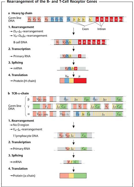 Fig. 1 a Heavy chain of human IgG. The designations for the gene segments in the variable part of the H chain are V (variable), D (diversity), and J (joining). The segments designated as µ, δ, γ, α, and e code for the constant region and determine the immunoglobulin class. The V segment occurs in several hundred versions, the D segment in over a dozen, and the J segment in several forms. V, D, and J segments combine randomly to form a sequence (VDJ) which codes for the variable part of the H chain. This rearranged DNA is then transcribed, creating the primary RNA transcript. The non-coding intervening sequences (introns) are then spliced out, and the resulting mRNA is translated into the protein product. b a chain of mouse T-cell receptor. Various different V, D, and J gene segments (for b and 5), V and J gene segments (for a and y) are available for the T-cell receptor chains. The DNA loci for the 5 chain genes are located between those for the a chain.