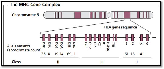 Fig. 2 The human major histocompatibility gene complex (HLA genes) is located on chromosome 6. There are three different classes of MHC molecules.
