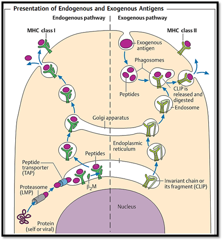 - -Intracellular antigens; these are cleaved into peptides within the proteasome and are usually associated with MHC class I molecules via the endogenous antigen processing pathway (Fig. 4, left side).