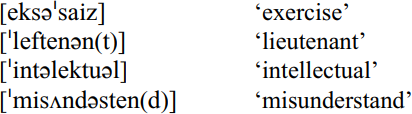 In the same vein, the MalE speaker often tends not to produce differential stress on pairs of words derived from the same root like RP Iimport (n) versus imIport (v). Such noun-verb derivatives are homophonous in MalE, as can be seen in an example like Malaysia produces a lot of rubber which is the import of many industrialized countries. In MalE the realizations of produces and import are ['prɔdjusiz] and [im'pɔ:t] respectively.