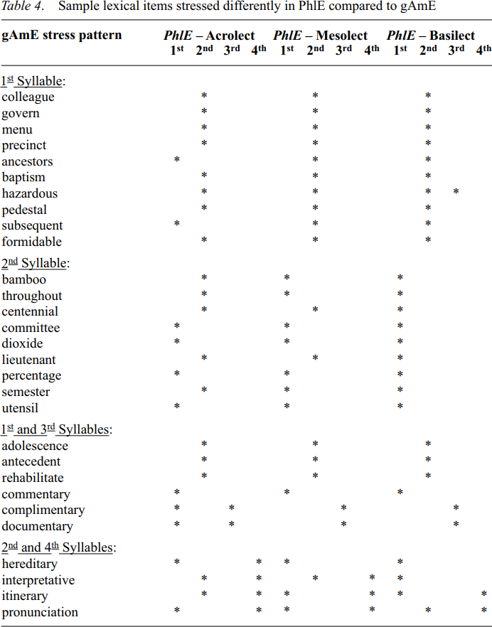 Word, sentence, and emphatic stress in PhlE were also examined to note deviations from gAmE. The findings of the studies reveal that there are words like baptism, hazardous, pedestal, utensil, dioxide, and percentage, whose word stress in all three varieties of PhlE differs from that of gAmE. Table 4 gives polysyllabic words found to be stressed differently from gAmE by all three groups.