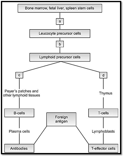 Fig. 1: Sites of blocks in the generation of immunodeficiency syndromes. (a) Reticular dysgenesis (b) severe combined immunodeficiency syndrome (c) Bruton's agamaglobulinemia (d) DiGeorge syndrome.