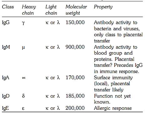 The ‘H’ chains are sub divided into five isotopes, on the basis of structural differences at the carboxyl terminal portion of the H chains. The Fab fragment is composed of L chains and linked with ‘N’ terminal portion of the H chains. The L chains are of two types, kappa (K) or lambda (λ). The heavy chains are of five different classes ϒ, |µ, ∝, δ and Ɛ, and each immunoglobulins IgG, IgM, IgA, IgD, and IgE. All five classes of immunoglobulin have two types of chains, and the molecular formula therefore reads λ 2, or k2r2. Table 13.1 gives outline of these immunoglobulin.