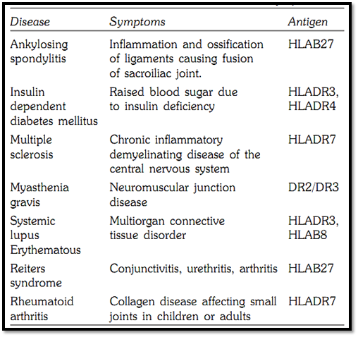 Certain HLA antigens show striking associations with certain diseases Table 2. The best known is the association of ankylosing spondylitis with HLAB27. While only 7% of the population has B27, the frequency in patients with ankylosing spondylitis is 95%. Other significant associations include HLADR3 and HLADR4 in insulin dependant diabetes mellitus, HLADR2 in multiple sclerosis, HLADR7 in psoriasis, HLAB27 in Reiter disease, HLADR7 in Rheumatoid arthritis and HLADR3 and HLAB8 in systemic lupus erythematosus.