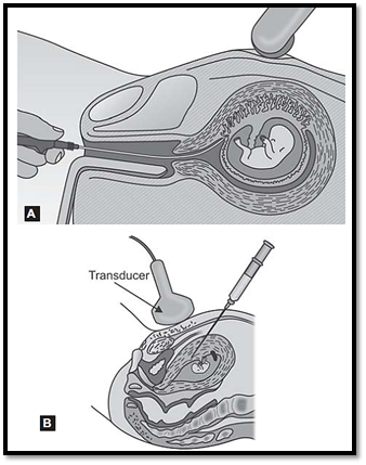 Figs .3A and B: Chorionic villous sampling. (A) Transcervical route, (B) Transabdominal route