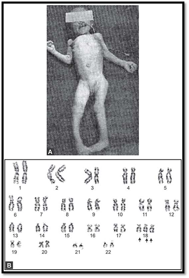 Figs 6A and B: (A) Fetus with trisomy 18. (B) Karyotype of the same fetus showing trisomy 18