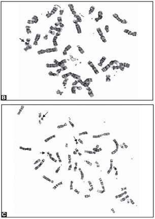 Figs. 7A and B: Prenatal karyotypes generated by culture of amniotic fluid. (A) Trisomy 21, (B) trisomy 13