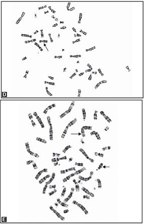 Figs 8A to E: Chromosomal abnormalities observed in fetal samples (A) Inversion Y (cord blood), (B) translocation t (14;21) cord blood, (C) trisomy21-(amniotic fluid) (D) 45XO-(chorionic villous sampling), (E) translocation t 8;15-(chorionic villous sampling)