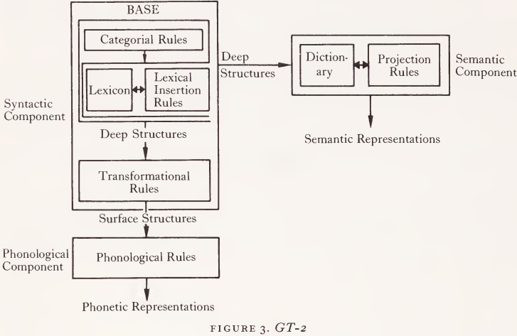 It will be remembered that the phrase structure component of a GT-1 grammar introduced lexical items as lists following some element such as N or V. Given the hierarchical arrangement of words and phrases required by this component, the statement of selectionai restrictions across words and phrases is extremely clumsy. Thus, we can exclude such ungrammatical sentences as *The hoy chase the dog only by setting up nouns which are either singular or plural. But nouns also may be animate or inanimate (i.e. *The rock hated the dog) independently of whether they are singular or plural. Chomsky (1965) suggests that an enormous simplification of the phrase structure component can be achieved by following the model of phonological and semantic analysis and describing each lexical item as a set of features. The syntactic component of a grammar (Figure 3) now consists of two major parts: a base component which generates deep structures and a transformational component which converts deep structures into surface structures. Deep structures provide the input to the interpretive semantic component while surface structures are the input to the interpretive phonological component. The base is further analyzed into a categorial component and a lexicon. The former consists of a set of ordered rewriting rules which provide the recursive power of the grammar and generate trees whose terminal elements consist of grammatical morphemes and empty categories (Δ). The lexicon consists of an unordered set of lexical entries each composed of a set of features. Lexical features are of three kinds: (1) Category features merely indicate the general category to which a lexical item must belong if it is to replace some Δ . Thus, an item with the feature [ + N] may be inserted only in a Δ dominated by N as indicated by the presence of a rule of the form N-> Δ.