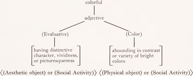 This attempt to present a principled basis for the definition of linguistic meaning is obviously crucial to the incorporation of semantics into grammar. It represents a cautious expansion of the domain of linguistic theories which regards and treats semantics as a completely secondary and subservient component of grammars. In operation, the semantic component takes as input a structural description of some sentence (S). It has available a dictionary entry for each word in S which states not only the syntactic classification of the word but also provides by the use of semantic markers, distinguishers and selection restrictions the information necessary for the operation of the projection rules which combine the meanings of individual words into the meanings possible for the whole sentence. For example, the dictionary entry for colorful will include, according to Katz and Fodor: