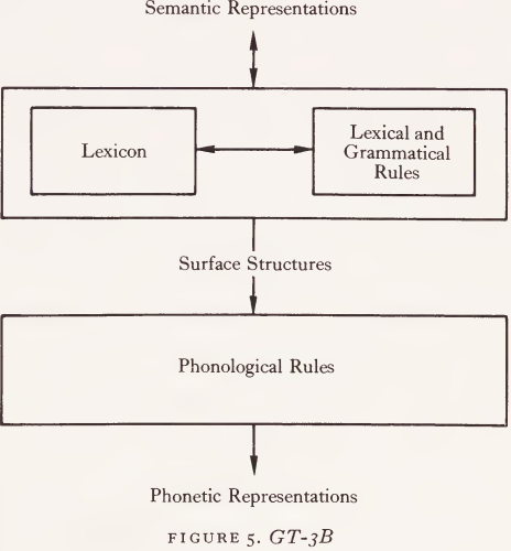 Chomsky’s paper represents the GT-3 A position (Figure 4) (with a semantic component as described by Katz). In it, he defines the standard theory as being equivalent to the theory of Aspects.2 The main effect of Chomsky’s revision of the standary theory (Figure 5) is to modify the requirement that semantic interpretations must be based exclusively on input from the base component in the form of deep structures. On the basis of work by Jackendoff, Kuroda and Emonds he argues that some aspects of meaning can only be accounted for by reference to certain aspects of the surface structure. Crucial to his argument are two semantic notions, focus and presupposition, which also occur in many of the other papers. The focus of a sentence is that part of it which presents new information and is often marked by stress, while the presuppositions of a sentence are those propositions not asserted directly, which the sentences presupposes to be true.