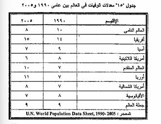 تبلغ معدلات الوفيات على مستوى العالم 9 في الألف عام 2005، وهــى في انخفاض تدريجي حيث كانت 11 فى الألف عام 1985، ونجد هناك فروقاً واضحة بين كل من الدول النامية والمتقدمة، ففى الوقت الذى انخفضت فيه معدلات الدول النامية من 10 إلى 8 في الألف خلال فى الفترة 1990 - 2005، وفي المقابل ارتفعت معدلات الدول المتقدمة من 7 إلى 10 خلال نفس الفترة، ويرجع ذلك إلى أن نسبة كبيرة من سكان المجتمعات الأوربية وصلت إلى قمة الهرم السكاني مما يعني شيخوخة المجتمع، ومن المعروف أن معدلات الوفيات ترتفع بين الفئات العمرية الأولى وفي قمة الهرم السكاني 65 سنة فأكثر.
