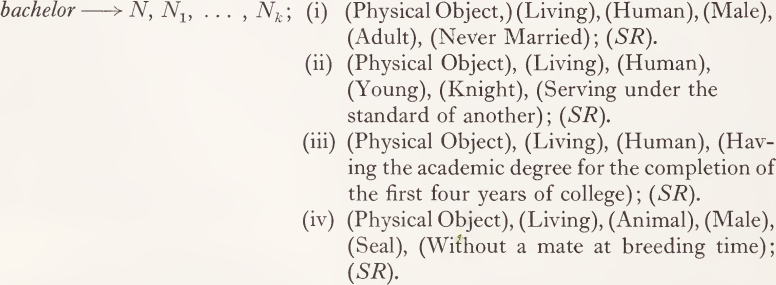 Just as syntactic markers enable us to formulate empirical generalizations about the syntactic structure of linguistic constructions, so semantic markers enable us to construct empirical generalizations about the meaning of linguistic constructions. For example, the English words ‘bachelor’, ‘man’, ‘priest’, ‘bull’, ‘uncle’, ‘boy’, etc., have a semantic feature in common which is not part of the meaning of any of the words ‘child’, ‘mole’, ‘mother’, ‘classmate’, ‘nuts’, ‘bolts’, ‘cow’, etc. The first set of words, but not the second, are similar in meaning in that the meaning of each member contains the concept of maleness. If we include the semantic marker (Male) in the lexical readings for each of the words in the first set and exclude it from the lexical entries for each of the words in the second, we thereby express this empirical generalization. Thus, semantic markers make it possible to formulate such generalizations by providing us with the elements in terms of which these generalizations can be stated. Moreover, such semantic generalizations are not restricted to words. Consider the expressions ‘happy bachelor’, ‘my cousin’s hired man’, ‘an orthodox priest I met yesterday ’, ‘ the bull who is grazing in the pasture ’, ‘ the most unpleasant uncle I have’, ‘a boy’, etc., and contrast them with the expressions ‘my favorite child’, ‘the funny mole on his arm’, ‘the whole truth’, ‘your mother’, ‘ his brother’s classmate last year ’, ‘ those rusty nuts and bolts ’, ‘ the cow standing at the corner of the barn ’, etc. Like the case of the previous sets of words, the members of the first of these sets of expressions are semantically similar in that their meanings share the concept maleness, and the members of the second are not semantically similar in this respect either to each other or to the members of the first set. If the dictionary entries for the words ‘bachelor’, ‘man’, ‘priest’, etc., are formulated so that the semantic marker (Male) appears in each, and if the projection rules assign derived readings to these expressions correctly on the basis of the entries for their words, then the semantic marker (Male) will appear in the derived readings for members of the first set but not in derived readings for members of the second. Again, we will have successfully expressed an empirical generalization about the semantics of a natural language. In general, then, the mode of expressing semantic generalizations is the assignment of readings containing the relevant semantic marker(s) to those linguistic constructions over which the generalizations hold and only those.