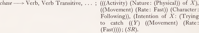 The semantic marker (Activity) distinguishes ‘ chase ’ in the intended sense from state verbs, such as ‘sleep’, ‘wait’, ‘suffer’, ‘believe’, etc., and from process verbs, such as ‘grow’, ‘freeze’, ‘dress’, ‘dry’, etc., and classifies ‘chase’ together with other activity verbs, such as ‘eat’, ‘speak’, ‘walk’, ‘remember’, etc. The semantic marker (Activity) is qualified as to nature by the semantic marker (Physical). This indicates that chasing is a physical activity and distinguishes ‘ chase ’ from verbs like ‘think’ and ‘remember’ which are appropriately qualified in their lexical readings to indicate that thinking and remembering are mental activities. But (Activity) is not further qualified, so that, inter alia, ‘ chase ’ can apply to either a group or individual activity. In this respect, ‘chase’ contrasts with ‘mob’ which is marked (Type: (Group)) - hence, we can predict the contradictoriness of ‘ Mary mobbed the movie star (all by herself)’, i.e., both one person did something to the star alone and also more than one did that very thing to the star. Also, ‘ chase ’ contrasts, in this respect, with ‘ solo ’, which is marked (Type: (Individual)) - hence, we can predict that ‘ They solo in the plane on Friday’ has the unique meaning that they each fly the plane by themselves on Friday. Moreover, the semantic marker (Movement) indicates that chasing involves movement of some kind that is left unspecified in the meaning of the verb ‘chase’, in contrast with a verb such as ‘walk’, ‘motor’, or ‘swim’. This movement is necessarily fast, as indicated by the semantic marker (Rate: (Fast)) which distinguishes ‘chase’ from ‘creep’, ‘walk’, ‘move’, etc. Further, this movement has the character of following, as indicated by (Character: (Following)) which distinguishes ‘chase’ from ‘flee’, ‘wander’, etc., and classifies it together with ‘ pursue ’, ‘ trail ’, etc. Again, for someone to be chasing someone or thing, it is not necessary that the person by moving in any specified direction. This fact is marked by the absence of a qualification on (Movement) of the form (Direction: ( )) which would be needed in the lexical readings for ‘ descend ’, ‘ advance ’, ‘ retreat ’, etc. But it is necessary that the person doing the chasing be trying to catch the person or thing he is chasing, so that ‘ chase ’ falls together with the verb ‘ pursue on the one hand, and contrast with ‘follow’, ‘trail’, etc., on the other. This is indicated by (Intention of X: (Trying to catch ((Y) ( )))), where ‘( )’ in the lexical reading under consideration is the semantic marker ((Movement) (Rate: (Fast))) which indicates that the person or thing chased is itself moving fast. It is sometimes held that the person chased must be fleeing from someone or something, but this is mistaken, since a sentence such as ‘ The police chased the speeding motorist ’ does not imply that the motorist is fleeing at all. Finally, note that ‘ chase ’ is not an achievement verb in the sense of applying to cases where a definite goal is obtained. It is not necessary for the person actually to catch the one he is chasing for him to have actually chased him, as is indicated by the nonanomalousness of sentences such as ‘He chased him but did not catch him’. Accordingly, ‘chase’ contrasts with ‘ intercept ’, ‘ trap ’, ‘ deceive ’, etc.