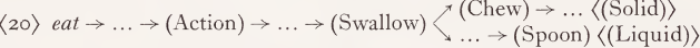 When one considers the phrases eat bread and eat soup, one realizes that eat has a slightly different meaning in each phrase: in the latter expression, but not in the former, it covers the manipulation of a spoon. Continuing the procedure applied in KF to polysemous items such as ball and colorful, one would have to represent the dictionary entry for eat by a branching path, perhaps as in (20):