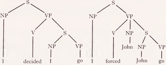 Let us first return in somewhat more detail to infinitive constructions, examining first the derivation of infinitives in general and then of the class of infinitive constructions which we mentioned as being characteristic of non-factive predicates. Basic to our treatment of infinitives is the assumption that non-finite verb forms in all languages are the basic, unmarked forms. Finite verbs, then, are always the result of person and number agreement between subject and verb, and non-finite verbs, in particular, infinitives, come about when agreement does not apply. Infinitives arise regularly when the subject of an embedded sentence is removed by a transformation, or else placed into an oblique case, so that in either case agreement between subject and verb cannot take place. There are several ways in which the subject of an embedded sentence can be removed by a transformation. It can be deleted under identity with a noun phrase in the containing sentence, as in sentences like I decided to go and I forced John to go (cf. Rosenbaum 1967).