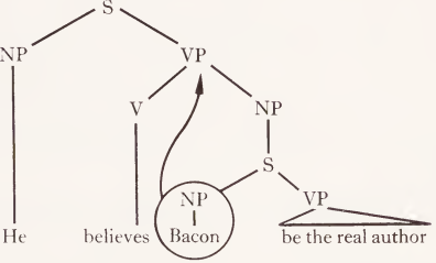 The circled noun phrase is raised into the upper sentence and becomes the surface object of its verb.1
