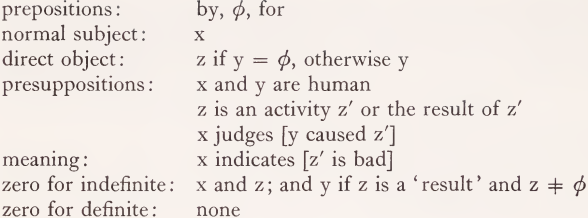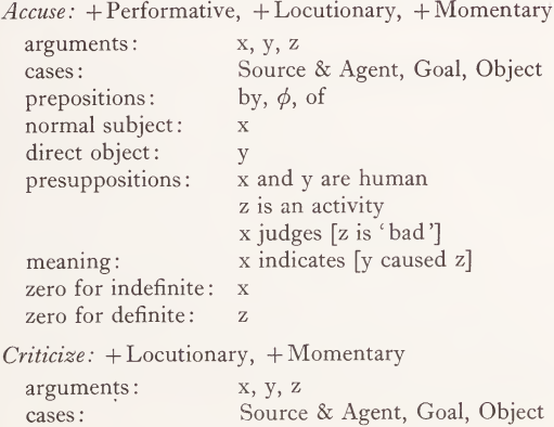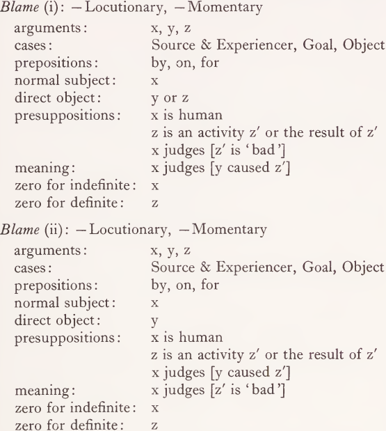 I exhibit extremely tentative suggestions for the lexical entries for blame (in two senses),1 accuse, and criticize (in one sense). The feature-pair ± Locutionary indicates whether the verb does or does not refer to a linguistic act; the feature + Performative marks verbs which can be used in first-person simple-present utterances in the performance of an explicitly marked illocutionary act:2 the feature-pair ± Momentary indicates whether or not the verb can be used, in the affirmative, to refer to an event that takes place at a specific point in time. The variables x, y, and z are argument variables whose case-role and preposition-selection properties are indicated by first, second or third position in the next two items. All are normal transitive verbs, and the normal subject-selection for active sentences is in each case the noun-phrase that fills the Source role. For blame the direct object is either the Goal or the Object, since we have both 'blame y for z ’ and ‘blame z on y’; for accuse the direct object is necessarily the Goal noun-phrase; for criticize it is the Goal noun-phrase if that is explicit in the sentence, otherwise the Object noun¬ phrase. The verbs accuse and criticize require the Goal noun-phrases to identify human beings; blame does not, since one can blame an event on, e.g., an inanimate force. The items identified as ‘zero for indefinite’ and ‘zero for definite’ indicate the conditions under which the explicit mention of an argument may be omitted.